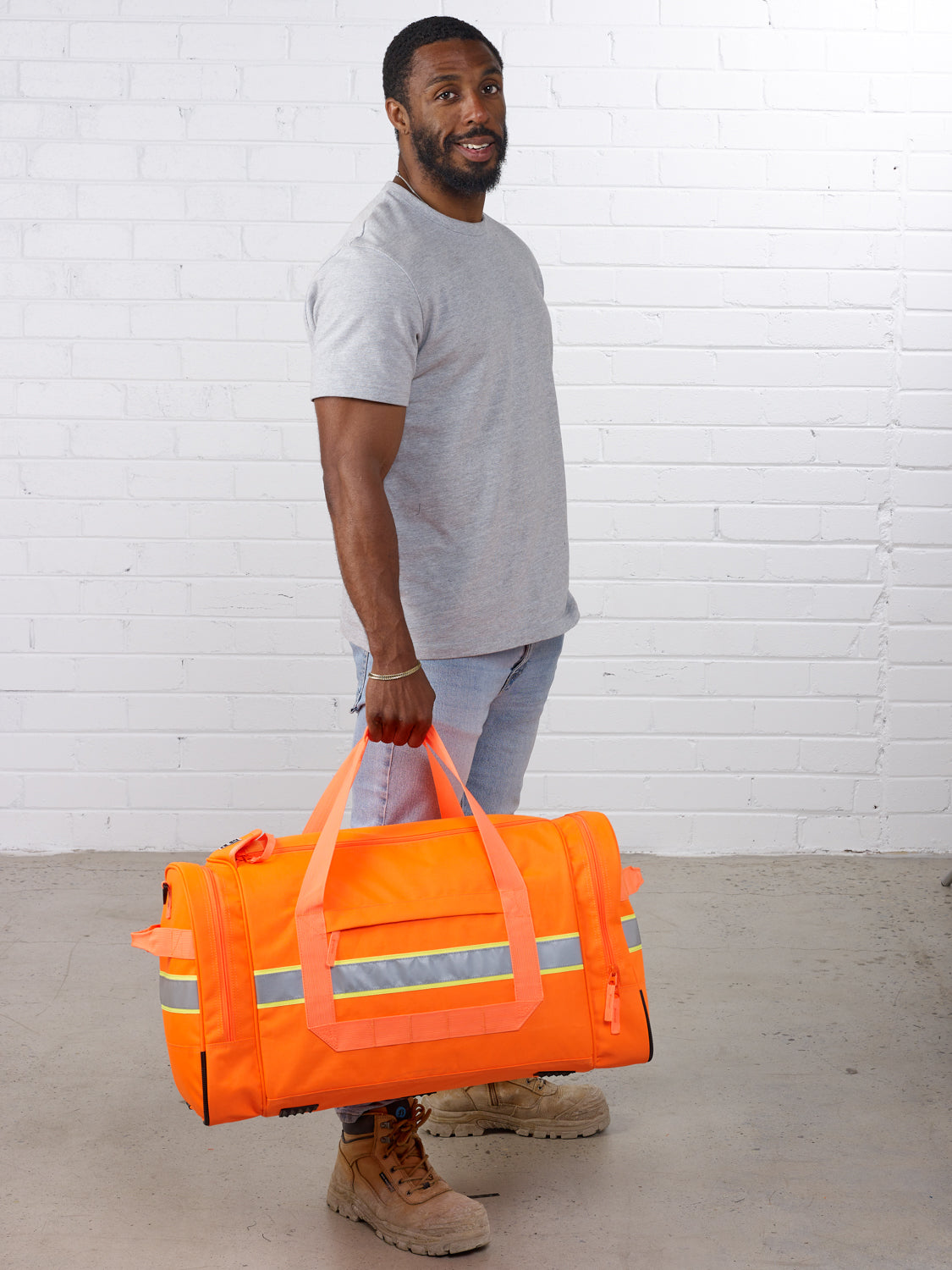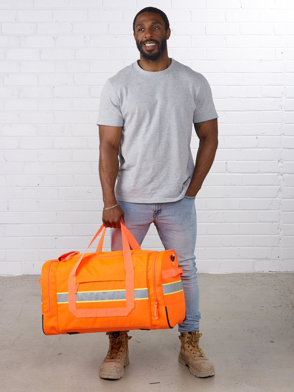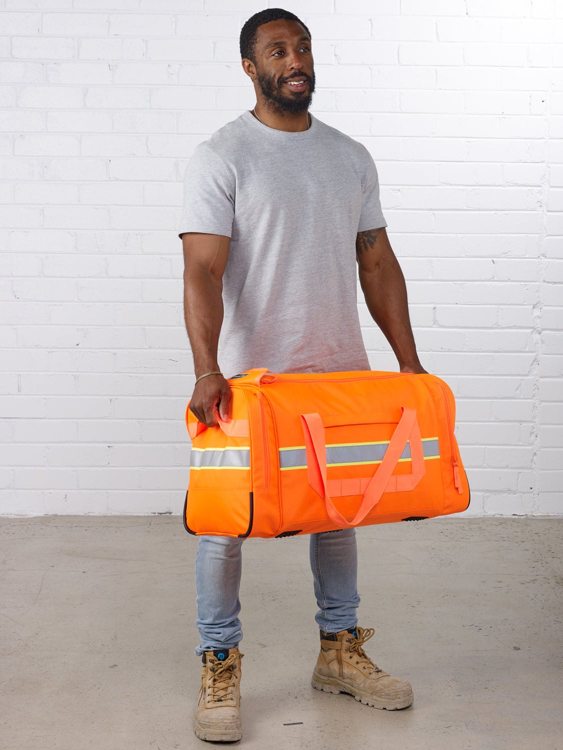 - Heavy duty high visibility orange 60L safety gear bag with reflective tape